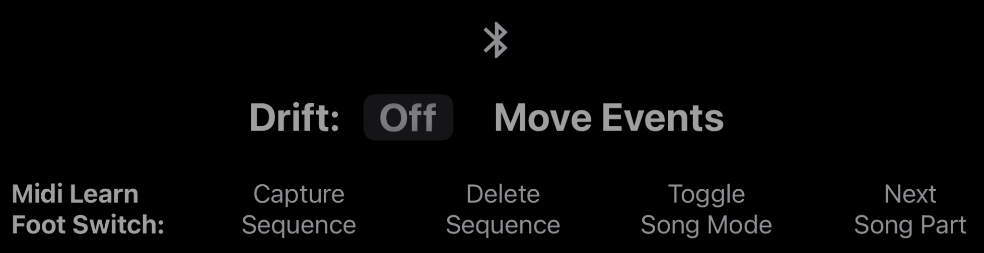 You can activate a bluetooth Midi connection and setup controllers for foot switch operations via Midi Learn. If your synths have sluggish arps or slow CC response times, set drift to On. It will delay Midi Clock by 1/96 note. Press Move Events to move your already recorded events accordingly.